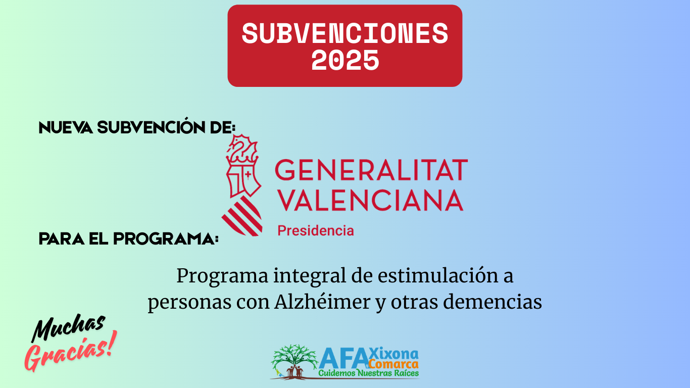 La Asociación de Familiares de Alzheimer y otras demencias de Xixona y Comarca (AFA Xixona) ha recibido de la Presidencia de la Generalitat Valenciana una subvención para el programa «Programa integral de estimulación a personas con Alzhéimer y otras demencias», a través de la convocatoria de subvenciones en materia de programas tercera edad y asociacionismo y en programas de actuaciones en enfermedades neurodegenerativas que afecten a las personas mayores, anualidad 2025.